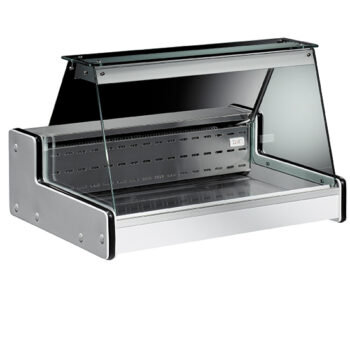 Ampia superficie espositiva in lamiera post verniciata bianca, atossica, idonea per alimenti (profondo 900 mm). Vetro qualità extrachiaro. Struttura superiore con vetri curvi temperati e cappello in alluminio anodizzato. Fiancate coibentate (spessore 40 mm). Ventilato. Pannello comandi elettronico. Riserva refrigerata a sportelli. Plafoniera con illuminazione a led. Piano di lavoro in acciaio inox. Vaschetta evapora-condensa automatica. Sbrinamento a fermata. Sbrinamento elettrico. Vetro deflettore.Frontale RAL 9005 (nero) – Rivestimento laterale RAL 9006 (grigio).Versione tropicalizzata su richiesta.