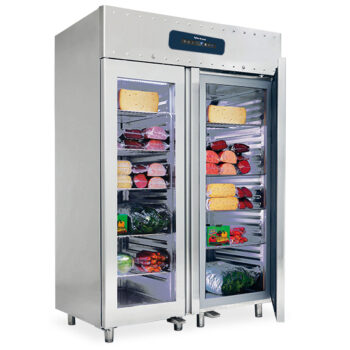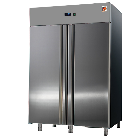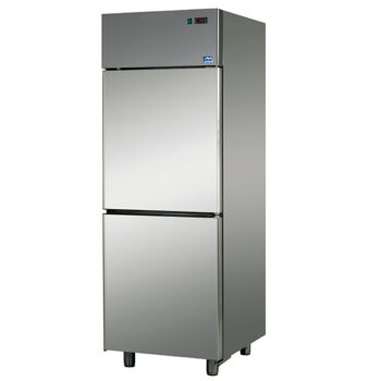 Interno ed esterno in Acciaio Inossidabile. Angoli interni arrotondati. Isolamento in poliuretano senza CFC, iniettato ad alta pressione. Spessore dell’isolamento: 60 mm. Porte a chiusura automatica con guarnizione magnetica. Pannello di controllo elettronico frontale. Refrigerazione ventilata. Unità refrigerante a monoblocco estraibile e tropicalizzata di serie (temperatura ambiente +43°C ed umidità relativa del 65%). Sbrinamento ed evaporazione dell’acqua di condensa completamente automatici. Con porta reversibile. Piedi in Acciaio Inossidabile regolabili in altezza. Dotazione di serie: 6 Griglie Rilsan GN 2/1. Versione ad efficienza energetica.