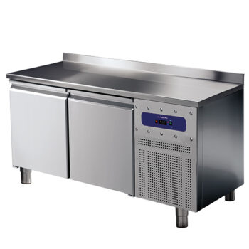 Tavolo refrigerato TN temperatura positiva -2°/+7°C Costruzione in acciaio inox interno ed esterno. Vano interno con angoli arrotondati. Coibentazione isolante ottenuta mediante schiumatura con poliuretano ad alta densità privo di CFC e spessore 50 mm. Piedini in acciaio regolabili in altezza. Fermo porta a 90° e richiamo automatico. Evaporatori trattati con verniciatura anticorrosione per assicurarne la maggiore durata. Temperatura ambiente di funzionamento +43°C. Sbrinamento automatico a cicli e convoglio dell’acqua direttamente in apposito contenitore ed evaporazione della stessa mediante una serpentina con ritorno di gas caldo. Gruppo frigorifero posizionato a destra. Pannello comandi dotato di interruttore e di display elettronico programmabile per il controllo e la visualizzazione della temperatura in cella conforme alle norme HACCP. Gas refrigerante R404A. In dotazione 4 cremagliere ed una griglia GN 1/1 plastificata per alimenti su coppia guide in acciaio inox per porta. Voltaggio 230V / 50Hz,